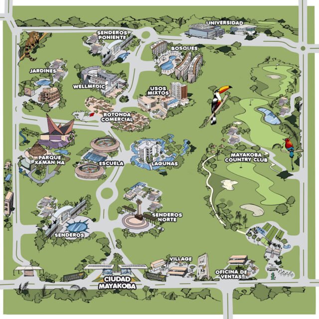Jardines de Ciudad Mayakoba se basa en la integración de comunidades en donde los residentes viven rodeados de áreas verdes, vialidades e infraestructura de servicios educativos, comerciales y recreativos en armonía con el entorno natural.